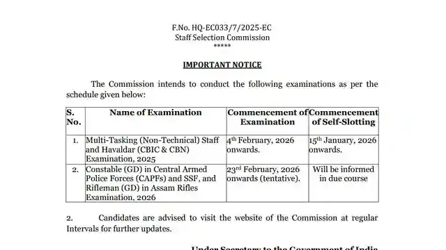 कर्मचारी चयन आयोग की तरफ से मल्टी टास्क की पोस्ट के अंतर्गत नॉन टेक्निकल तथा हवलदार पदों पर भर्ती के लिए परीक्षा का आयोजन 4 फरवरी को किया जाना है। इसके लिए एसएससी एमटीएस सिर्फ स्लॉट बुकिंग की प्रक्रिया 15 जनवरी 2026 से शुरू कर दी गई है।
