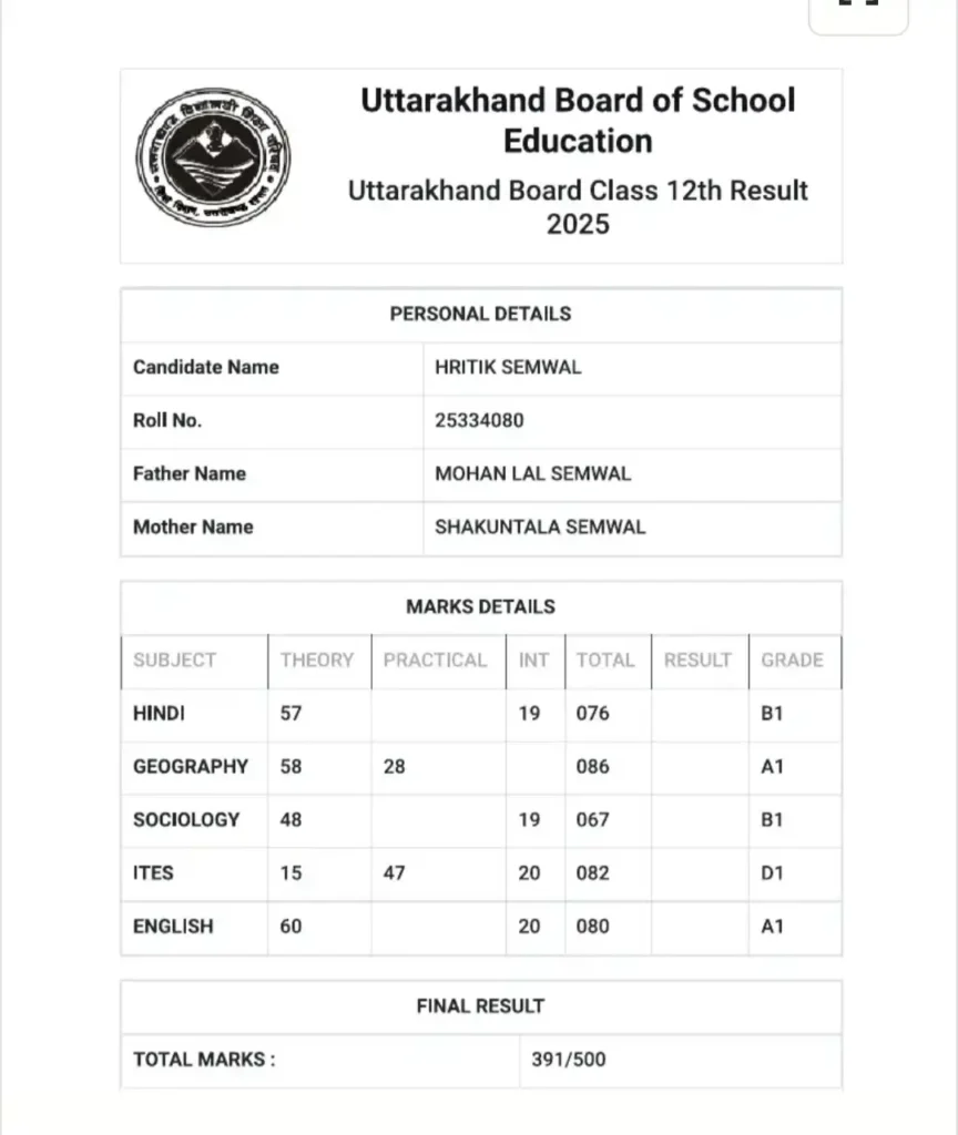- आपका Uttrakhand Board 10th 12th Result 2026 स्क्रीन पर दिखाई देगा, इसे डाउनलोड करें और भविष्य के लिए प्रिंटआउट निकाल लें।